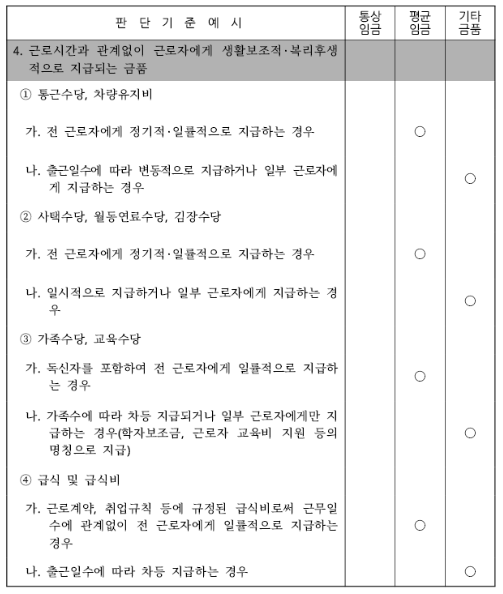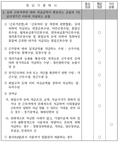 근로계약이나 취업규칙 또는 단체협약 등에 의하여 소정근로시간(없는경우 법정근로시간)에 대하여 근로자에게 지급하기로 정하여진 기본급 임금과 정기적 일률적으로 임금산정기간에 지급하기로 정하여진 고정급 임금으로 한다.