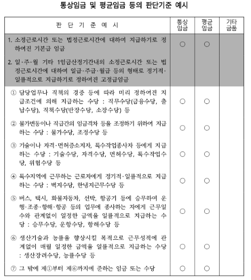 해고예고수당, 휴업수당, 유급휴일, 연장,야간,휴일근로수당, 연차 유급휴가수당, 출산전후휴가수당등과 그 밖에 노동관계법에 규정된 통상임금의 계산에 적용한다.